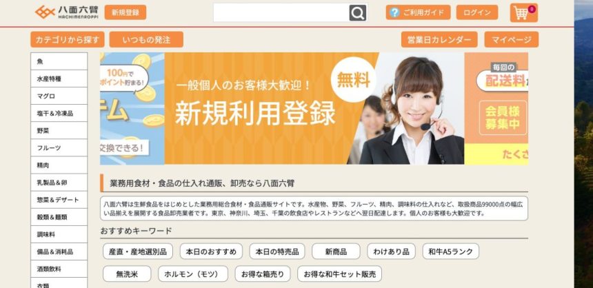 八面六臂は生鮮食品をはじめとした業務用総合食材・食品通販サイトです。水産物、野菜、フルーツ、精肉、調味料の仕入れなど、取扱商品99000点の幅広い品揃えを展開する食品卸売業者です。東京、神奈川、埼玉、千葉の飲食店やレストランなどへ翌日配達します。